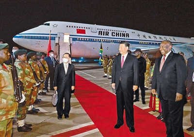 当地时间8月21日晚,国家主席习近平抵达约翰内斯堡,出席金砖国家领导人第十五次会晤并对南非进行国事访问。