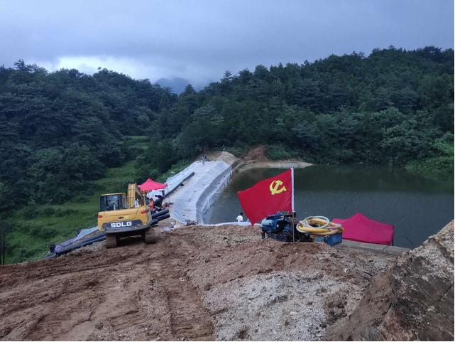 “公田镇党委文件,关于成立羊基山水库抢险临时党支部的决定,党支部书记李龙、副书记高雄辉、党员周海、龙江、方秋林、卢俊彪……,临时党支部的任务就是今天内要采用技术手段将羊基山水库库容排小、确保不发生垮堤。”这是7月10日上午10点李龙镇长在公田镇飞云村羊基山水库宣布的一份文件。