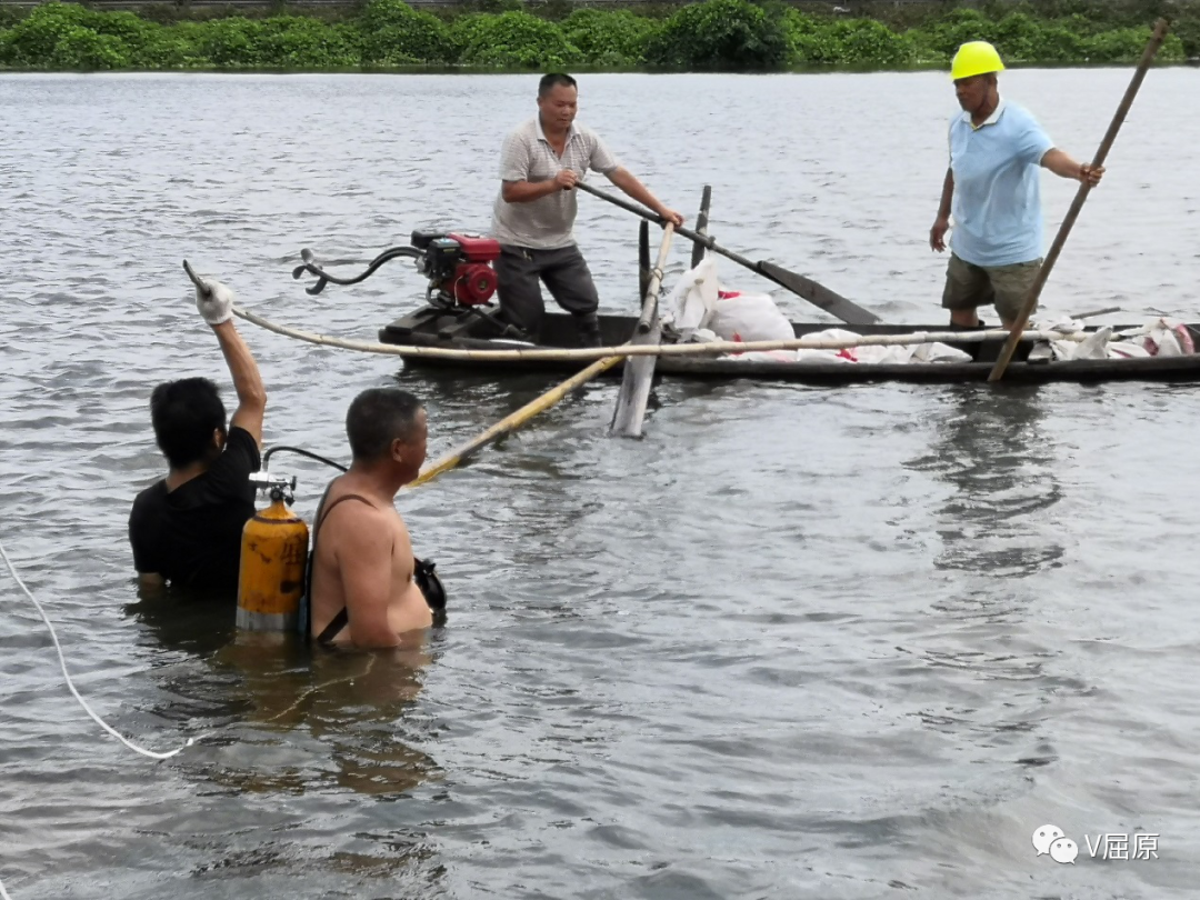 7月10日晚,万家坝低闸穿堤涵管漏水,因为水位上涨,临水面上的拍门就剩下3个,其余10个都依次排列至水底,最深的拍门在将近8米的水下。要解除隐患,必须一个个排查是否是拍门不严引起的渗水。村上的党员群众一起来帮忙。河面风大,65岁的老技术员钟建文站在小船上,一边举着一根几十斤重的铁杆控制船身位置,一边指挥岸上的群众协助定位。村民刘雨辰水性好,就直接下水,站在齐胸的水里帮忙固定船身。今年刚转正的党员张新辉用力拉住绳子,为船身的移动助力。尽管系了安全绳,大家纷纷捏把汗,生怕小船侧翻,在船上的钟建文却有如定海神针,熟练指挥着大家协助固定好船身,潜水员下水后,很快找准了渗水的拍门,钟建文将泥石递下去,大家齐心协力,渗水很快得到控制。