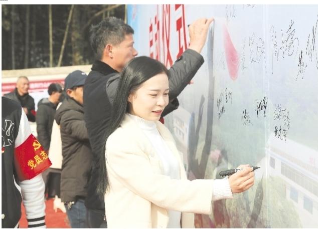 党员群众纷纷上台签名承诺争当村庄清洁行动排头兵