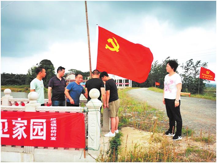 临湘文旅广电局巡堤查险突击队员们正在坦渡杨花咀责任堤段挂党旗。