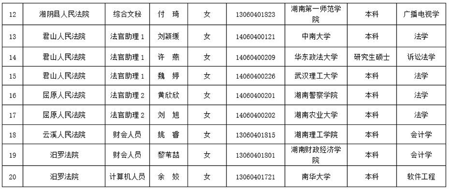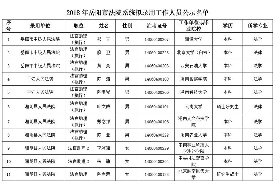 根据中共湖南省委组织部、湖南省人力资源和社会保障厅、湖南省公务员局发布的《湖南省2018年考试录用公务员公告》,经报名、笔试、资格审核、面试、体检、考察,现对岳阳法院系统拟录用的20名工作人员进行公示。