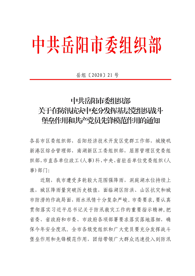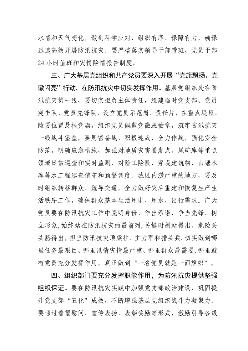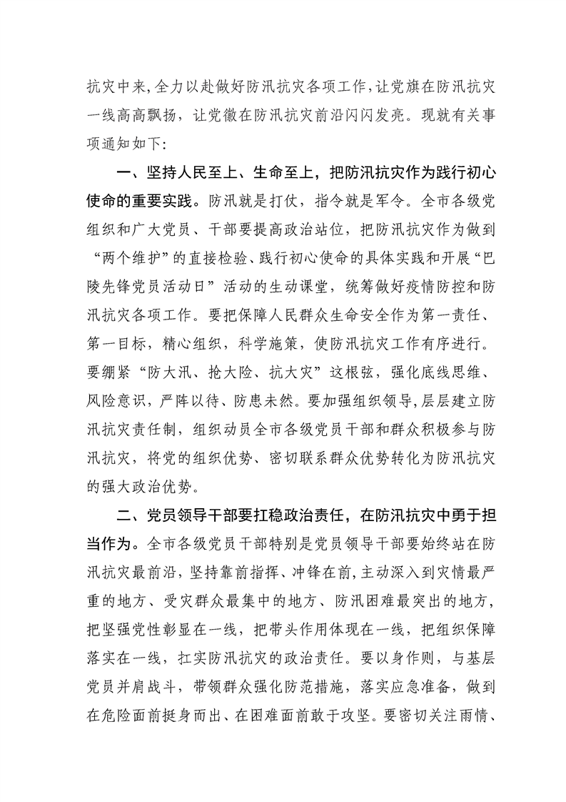 关于在防汛抗灾中充分发挥基层党组织战斗 堡垒作用和共产党员先锋模范作用的通知