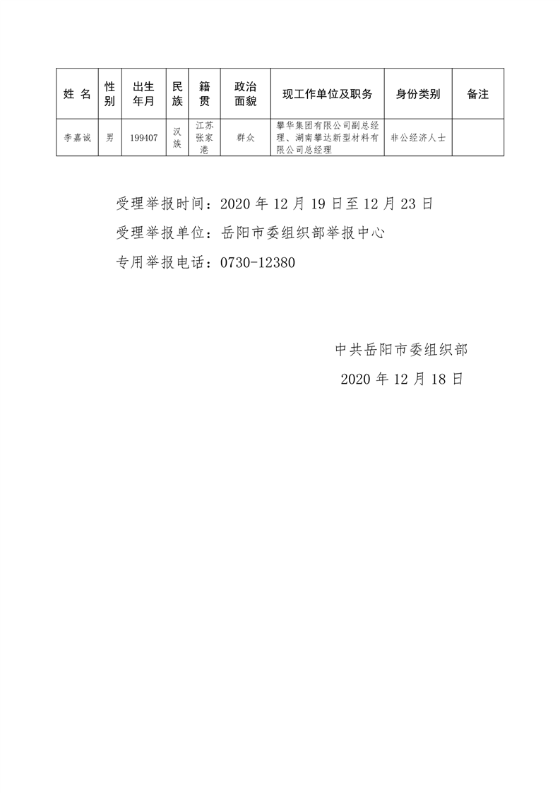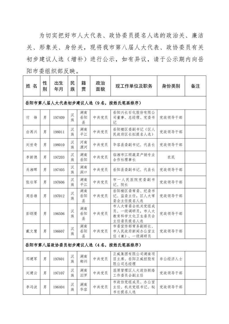 岳阳市第八届人大代表、政协委员 初步建议人选(增补)公示公告