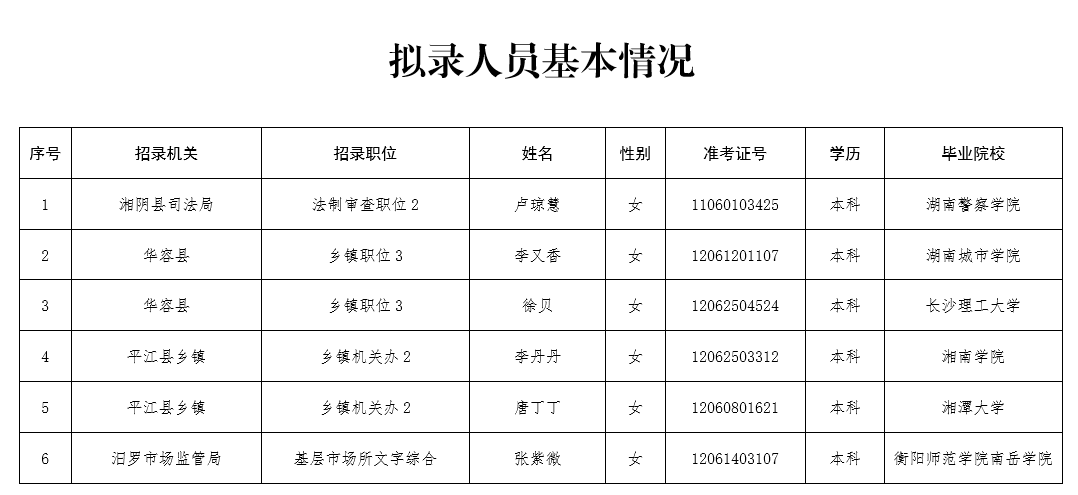 根据《湖南省2021年考试录用公务员公告》及有关规定,经报名、笔试、资格审查、面试、体检、考察等程序,确定卢琼慧、李又香、徐贝、李丹丹、唐丁丁、张紫微6名同志(因怀孕延期体检,产后体检合格)为2021年度拟录用公务员,现予以公示。