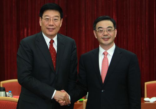 周强同志与徐守盛同志亲切握手。