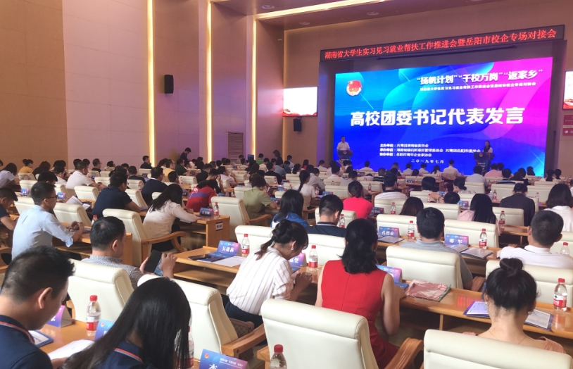 7月11日上午,“扬帆计划”“千校万岗”“返家乡”湖南省大学生实习见习就业帮扶工作推进会暨岳阳市校企专场对接会在城陵矶新港区召开。共青团湖南省委书记汤立斌,市委常委、统战部长、新港区党工委第一书记熊炜出席,共青团湖南省委副书记谢君毅为湖南省“扬帆计划”“千校万岗”实习就业基地揭牌。