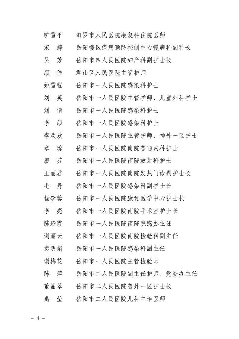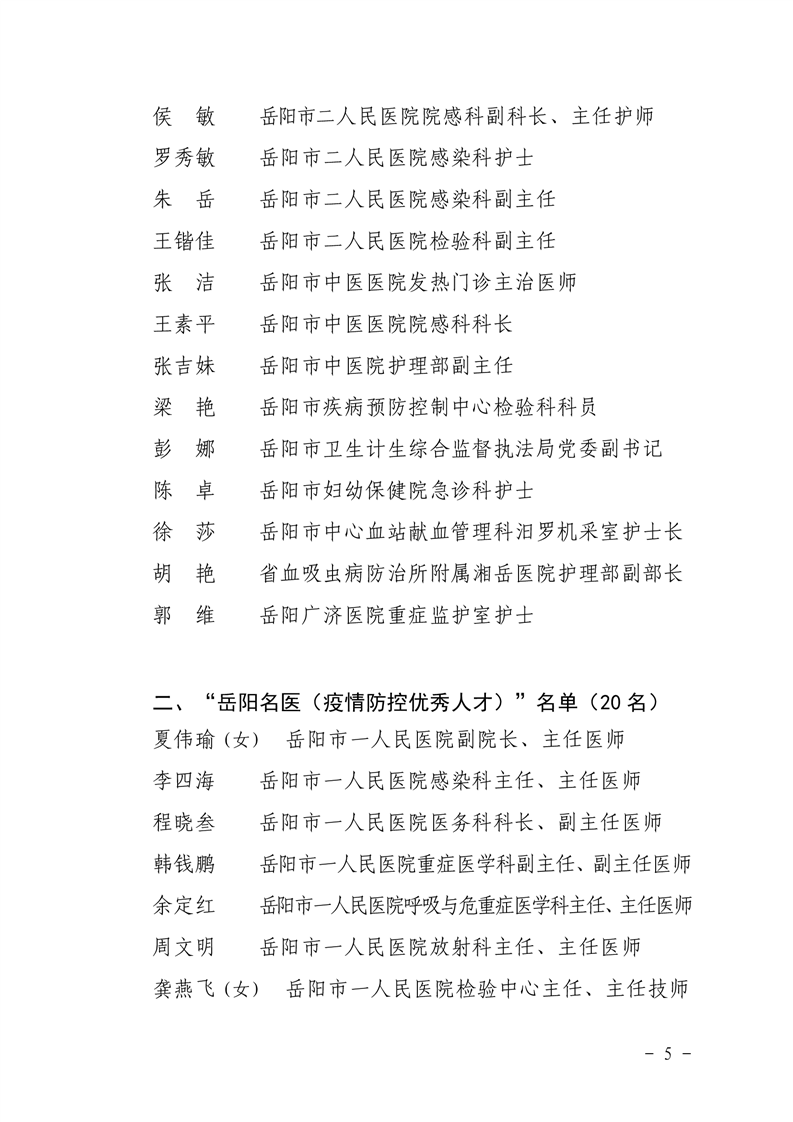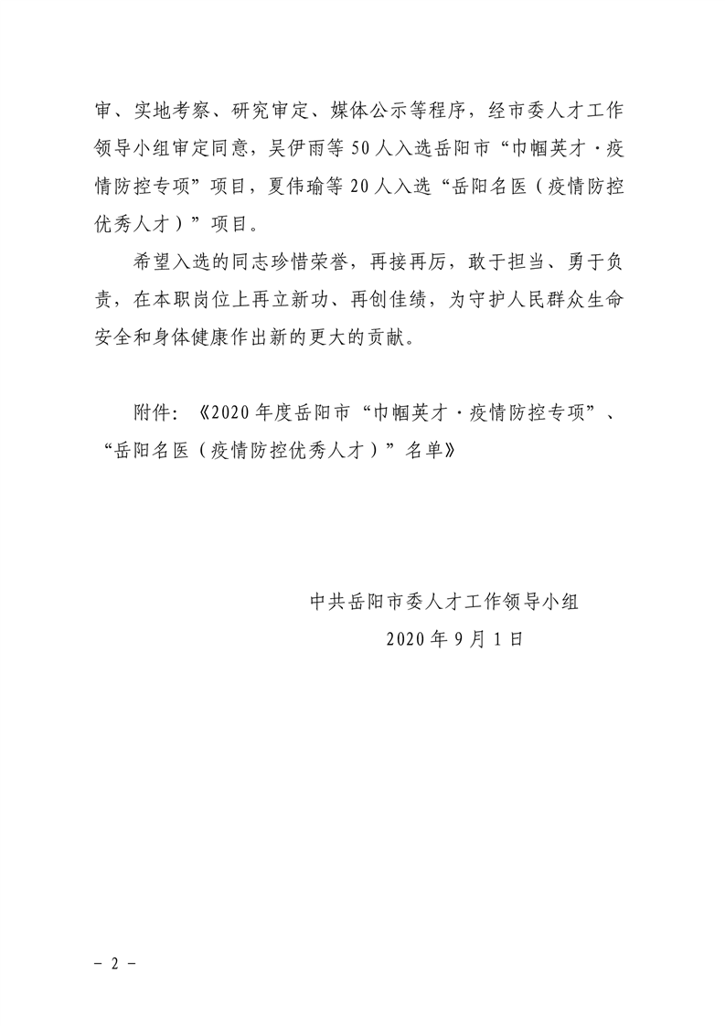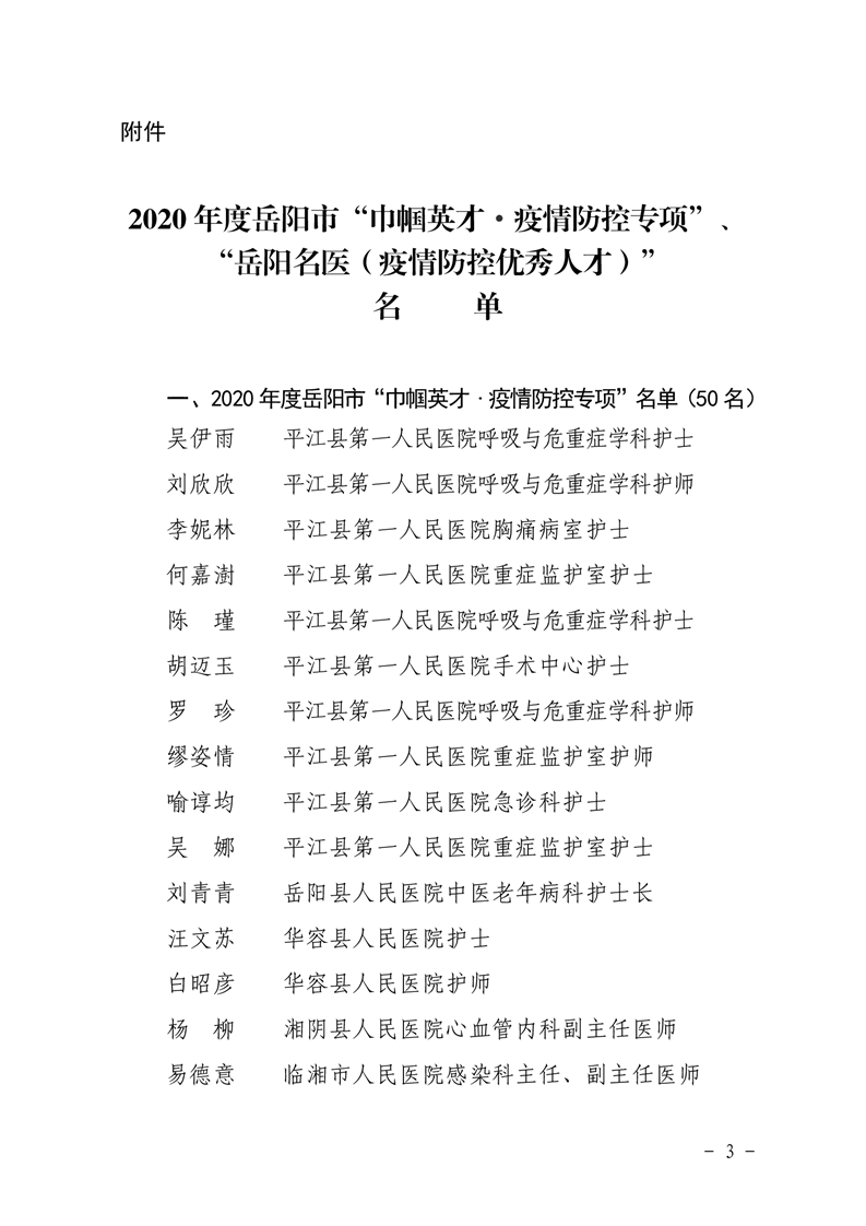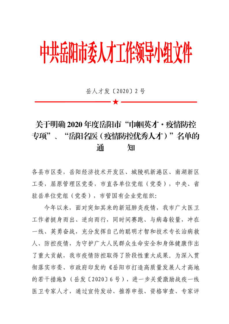 关于明确2020年度岳阳市“巾帼英才.疫情防控专项”、“岳阳名医(疫情防控优秀人才)”名单的通知