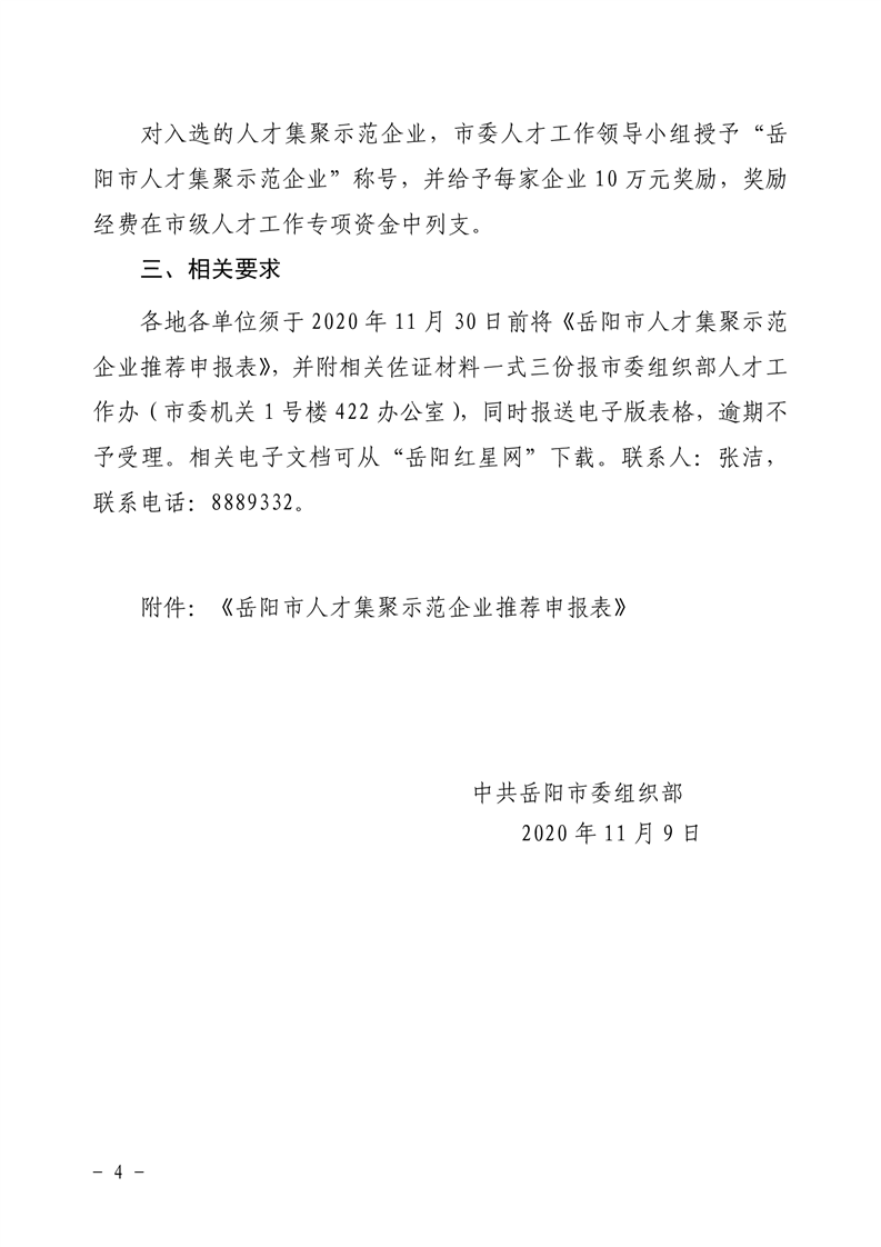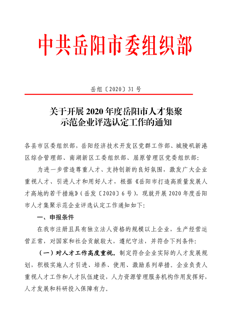 关于开展2020年度岳阳市人才聚集示范企业评选认定工作的通知