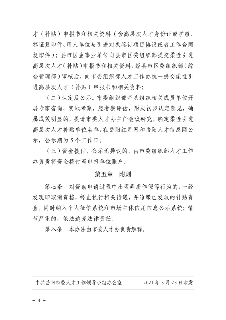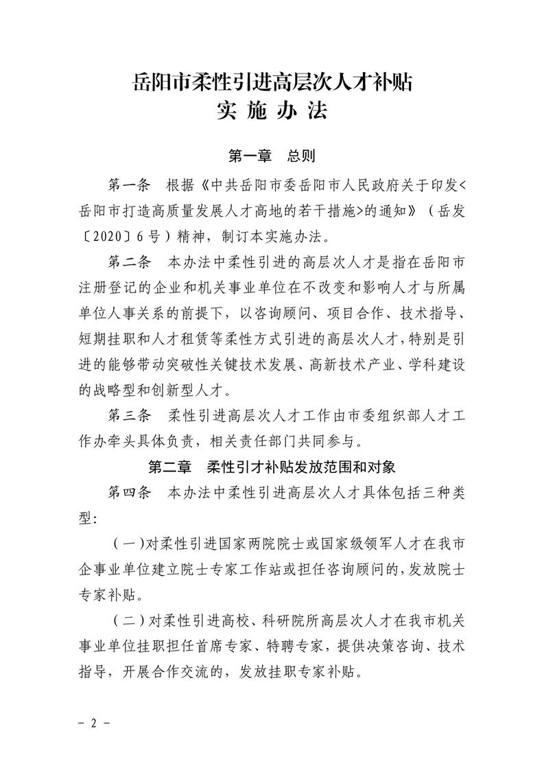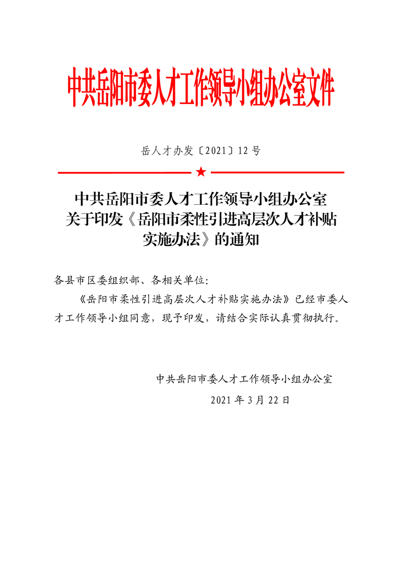 关于印发《岳阳市柔性引进高层次人才补贴 实施办法》的通知