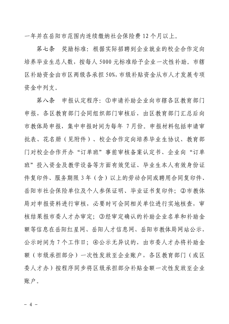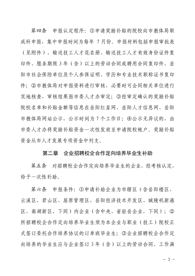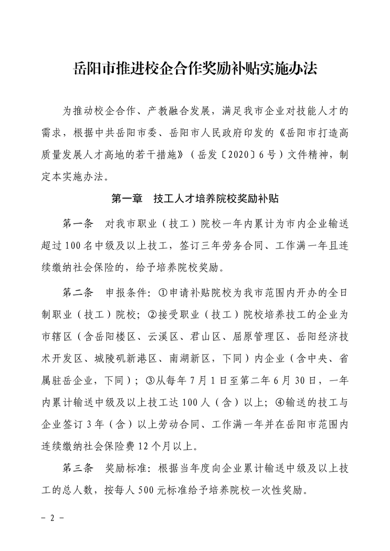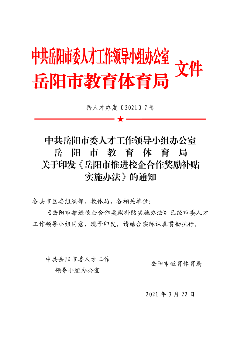 关于印发《岳阳市推进校企合作奖励补贴实施办法》的通知