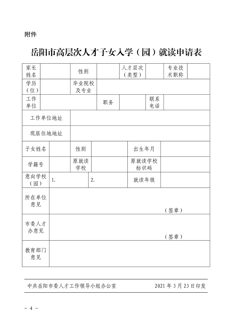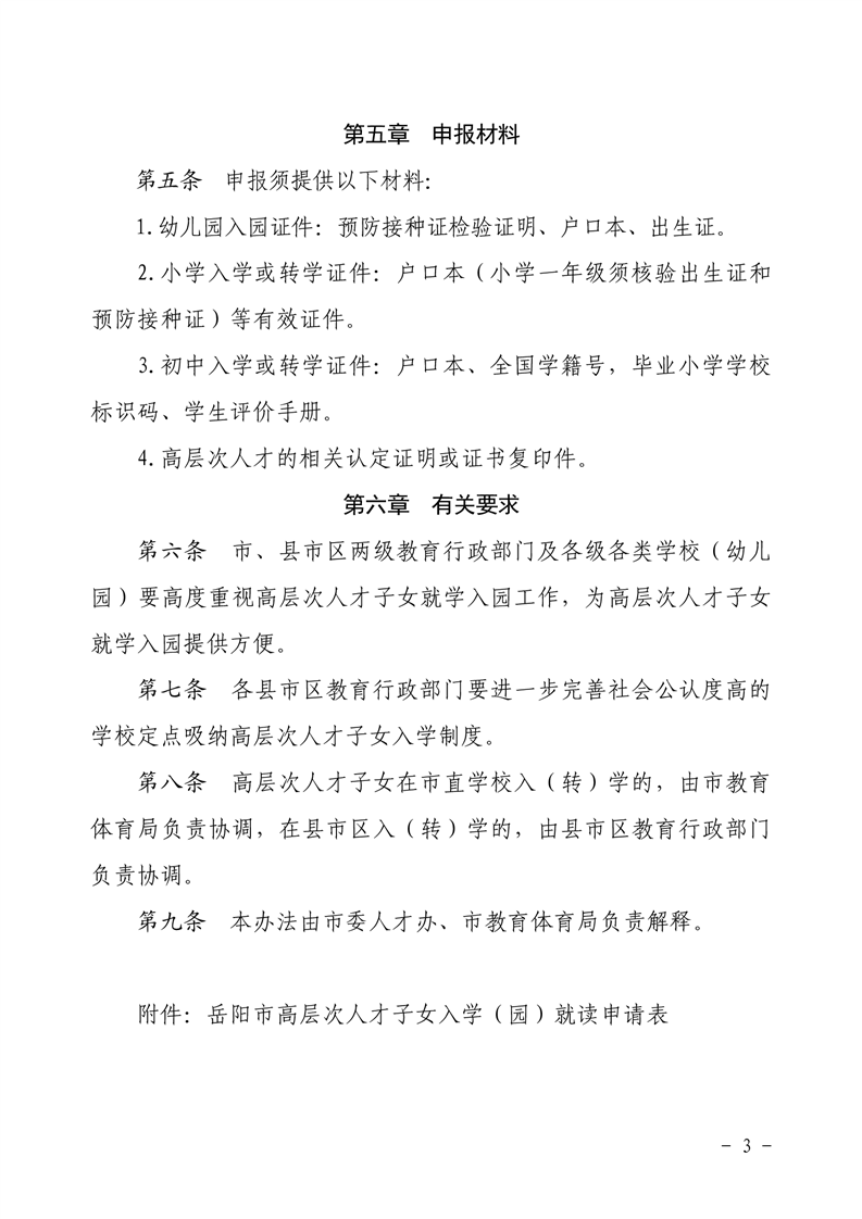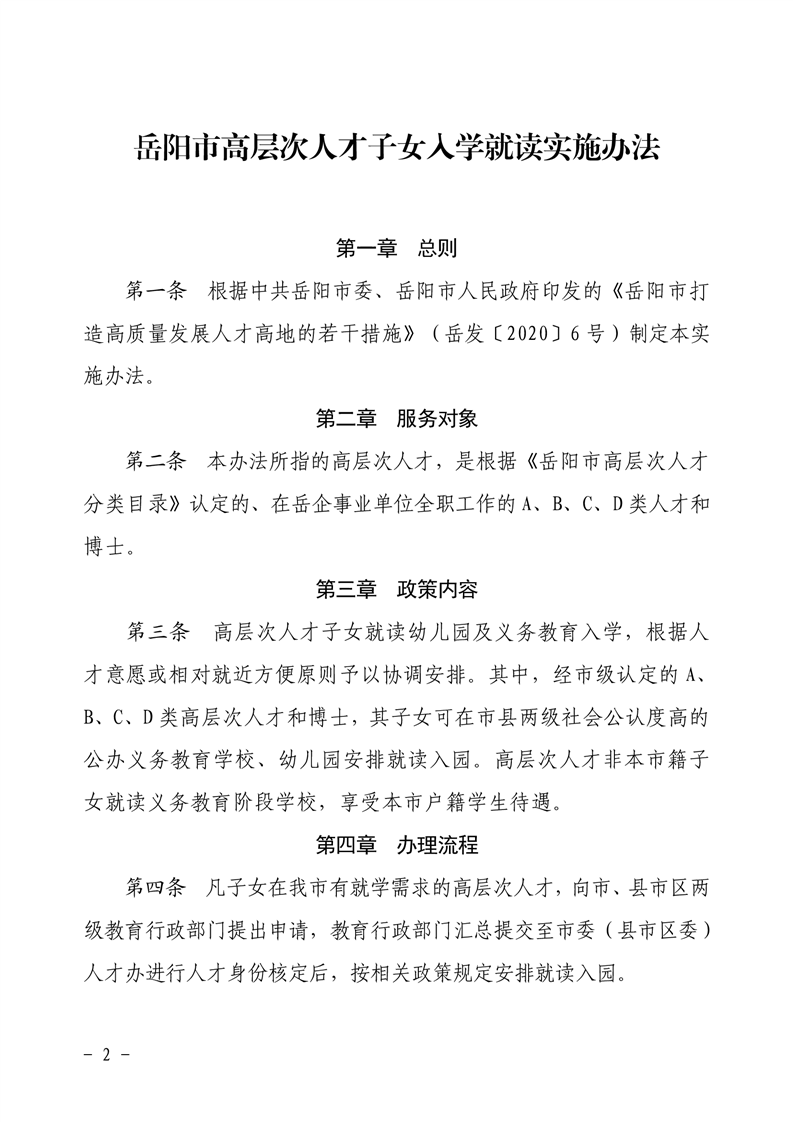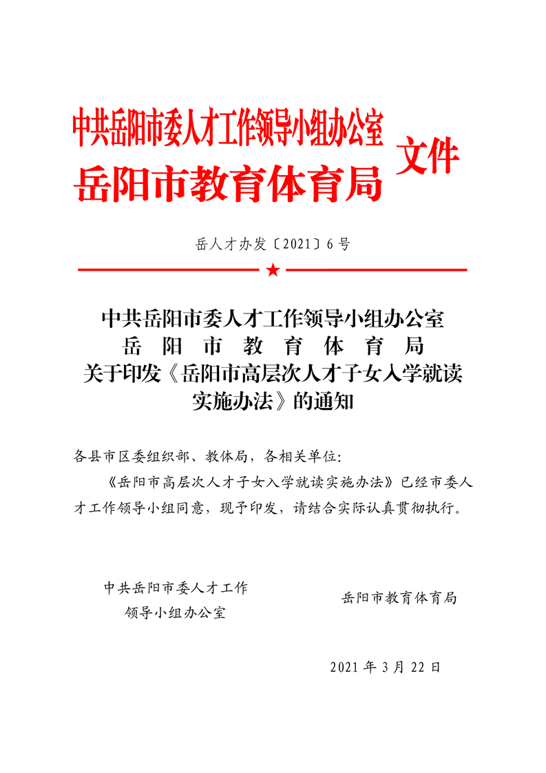 关于印发《岳阳市高层次人才子女入学就读实施办法》的通知