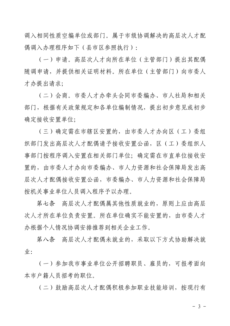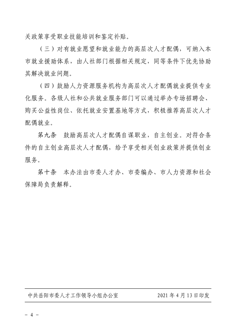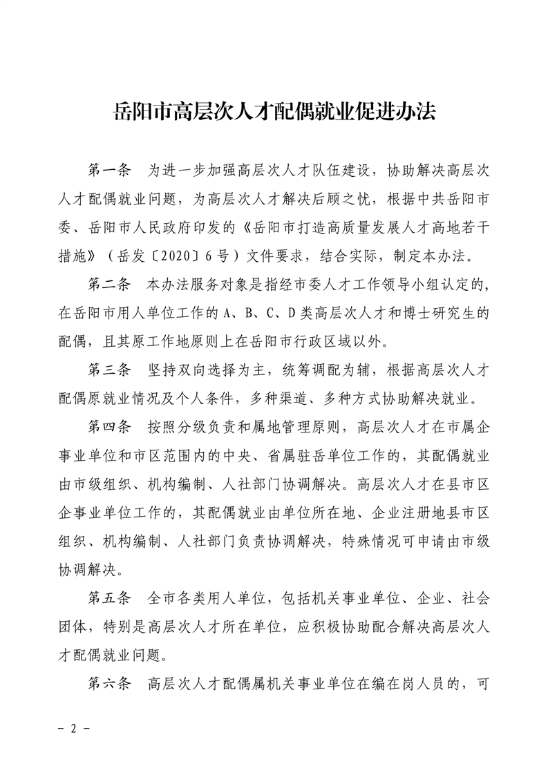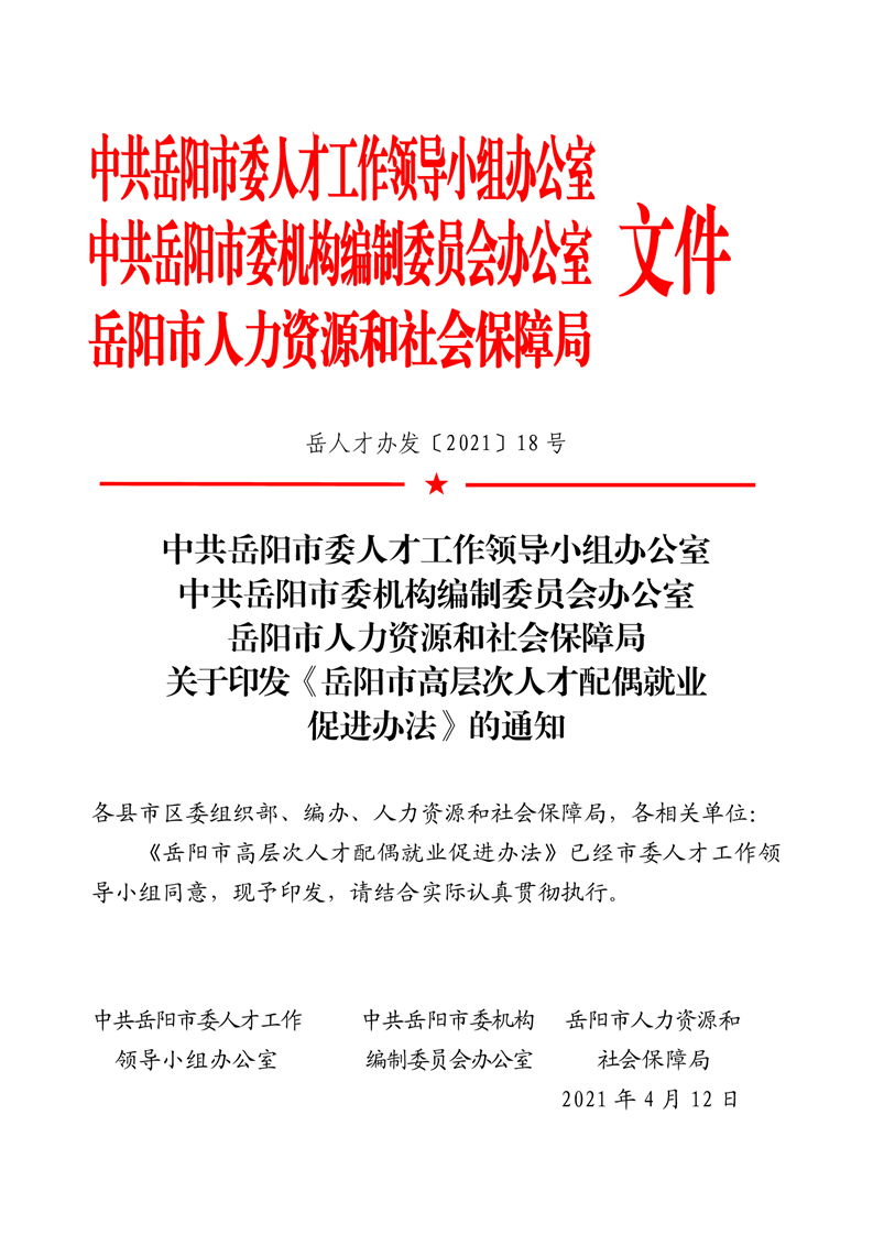 关于印发《岳阳市高层次人才配偶就业促进办法》的通知