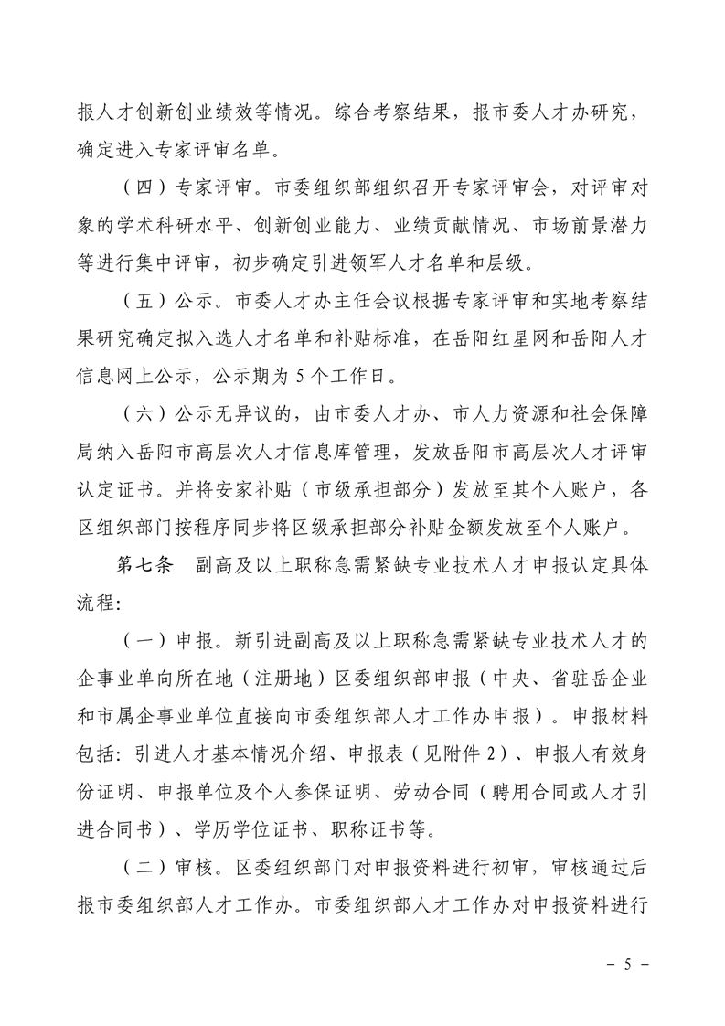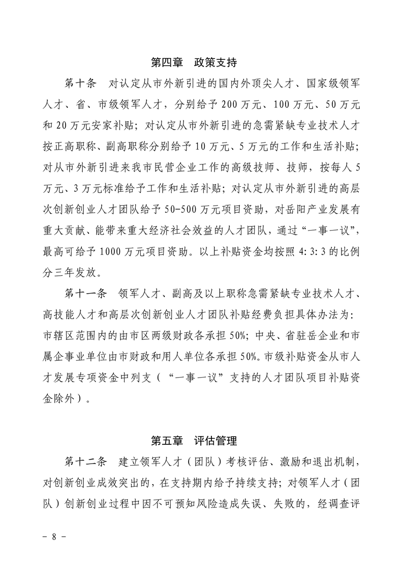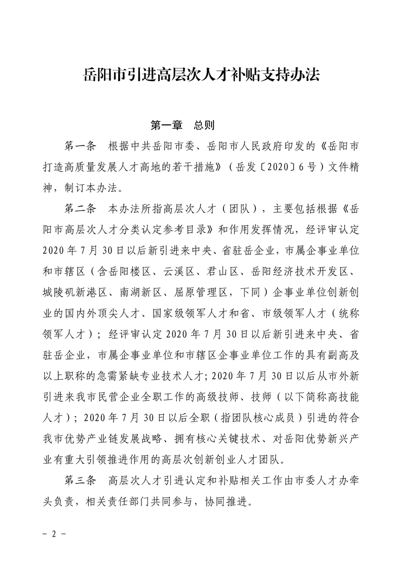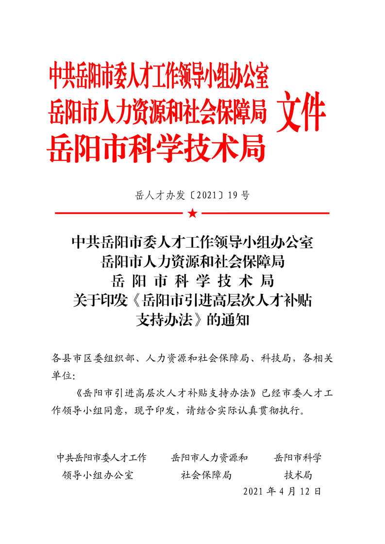 关于印发《岳阳市引进高层次人才补贴支持办法》的通知