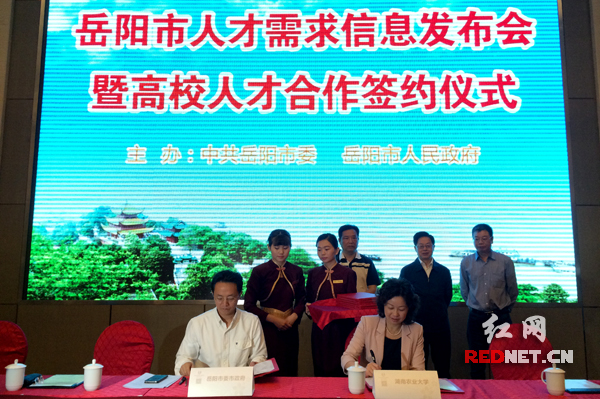 本次发布会上,岳阳市委、市政府还与湖南省内部分高校签订了人才合作框架协议,邀请了省城十三所重点院校相关负责人就政府、高校、企业等如何在优秀人才培育及引进就业方面建立深入合作关系进行了研讨,岳阳市介绍了在中高层次人才引进、培养、创业等方面的各项扶持政策。